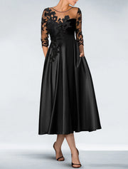 A-Line Cocktail Black Dress Appliques Elegant Dress Fall Wedding Guest Dress For Mother Knee Length 3/4 Length Sleeve Off Shoulder Pocket Satin with Beading Pocket - US 2 / UK 6 / EU 32