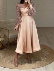 A-Line Cocktail Dresses Elegant Dress Wedding Guest Party Wear Tea Length Long Sleeve V Neck Fall Wedding Guest Satin with Ruched - US 2 / UK 6 / EU 32