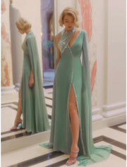 A-Line Evening Gown Elegant Dress Formal Court Train Sleeveless V Neck Sequined with Glitter Pleats Slit