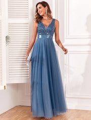 A-Line Evening Gown Empire Dress Evening Party Prom Floor Length Sleeveless V Neck Belt / Sash Tulle V Back with Glitter Embroidery