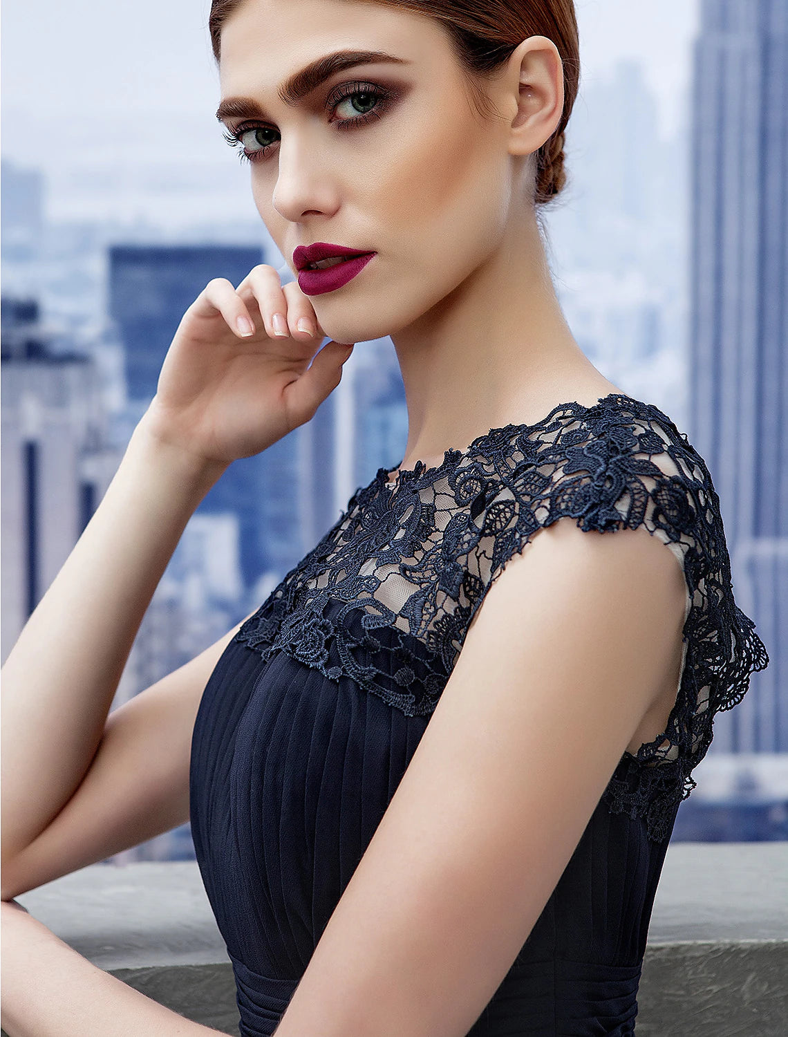 A-Line Evening Gown Empire Dress Wedding Guest Formal Evening Floor Length Short Sleeve Boat Neck Bridesmaid Dress Chiffon with Ruched Lace Insert - US 2 / UK 6 / EU 32
