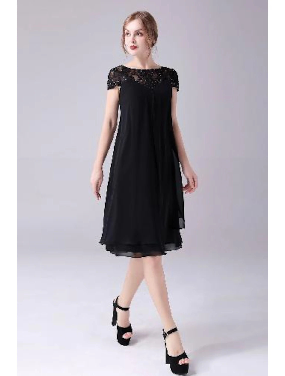 A-Line Mother of the Bride Dress Plus Size Elegant Jewel Neck Knee Length Chiffon Short Sleeve with Lace Beading Tier
