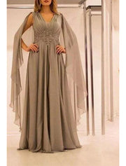 A-Line Plus Size Curve Mother of the Bride Dresses Elegant Cape Dress Dress Formal Wedding Guest Floor Length Short Sleeve V Neck Chiffon with Pleats Beading - US 2 / UK 6 / EU 32