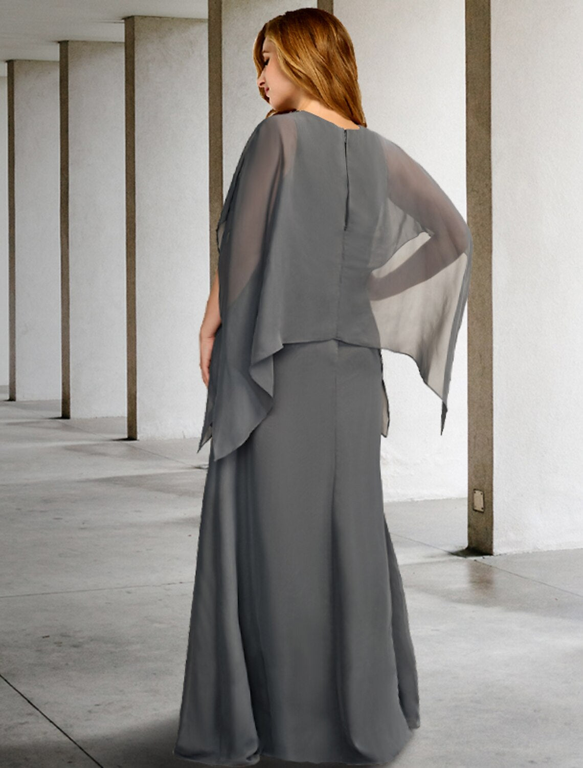 A-Line Plus Size Curve Mother of the Bride Dresses Elegant Dress Formal Floor Length Short Sleeve V Neck Chiffon with Beading Ruffles - US 2 / UK 6 / EU 32