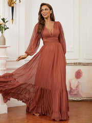A-Line/Princess 30D Chiffon Ruffles V-neck Long Sleeves Sweep/Brush Train Dresses