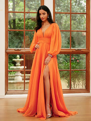 A-Line/Princess 30D Chiffon Ruffles V-neck Long Sleeves Sweep/Brush Train Dresses