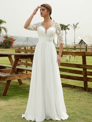 A-Line/Princess Chiffon Lace V-neck 1/2 Sleeves Floor-Length Wedding Dresses