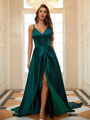 A-Line/Princess Elastic Woven Satin Ruffles V-neck Sleeveless Court Train Dresses