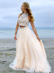 A-Line/Princess High Neck Tulle Beading Sleeveless Floor-Length Two Piece Dresses