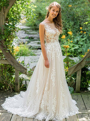 A-Line/Princess Lace Applique Scoop Sleeveless Sweep/Brush Train Wedding Dresses