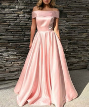 A-Line/Princess Pink Off The Shoulder Mermaid Prom Dress With Pockets