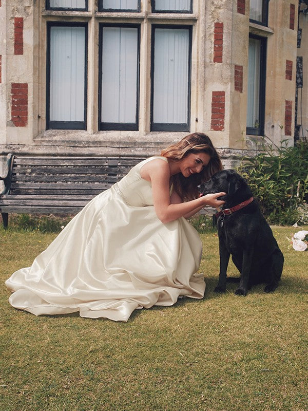 A-Line/Princess Satin Beading V-neck Sleeveless Sweep/Brush Train Dresses