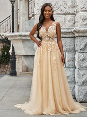 A-Line/Princess Sleeveless Tulle V-neck Applique Sweep/Brush Train Wedding Dresses