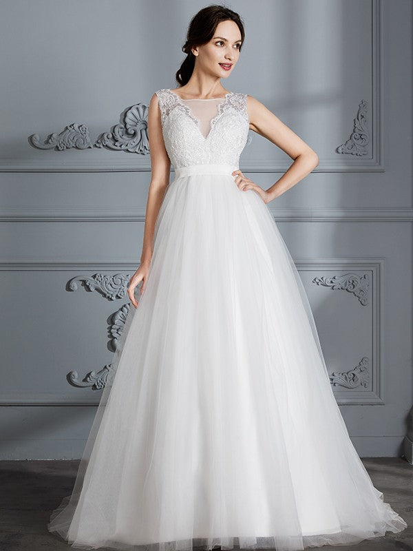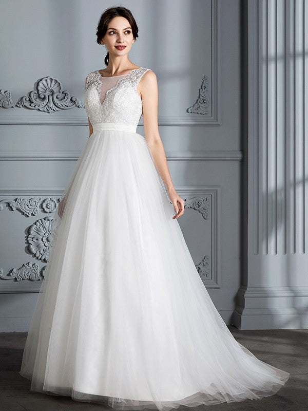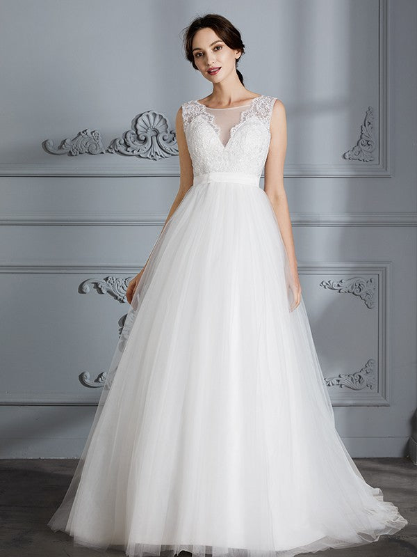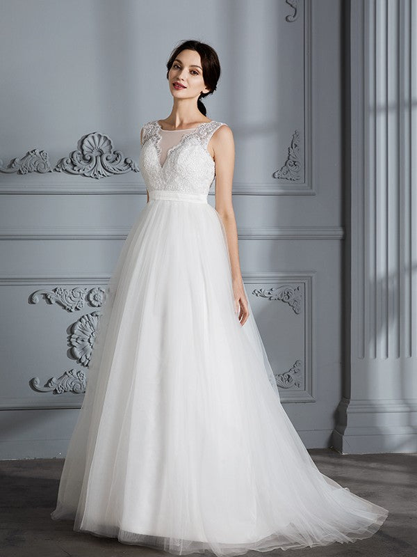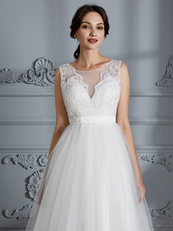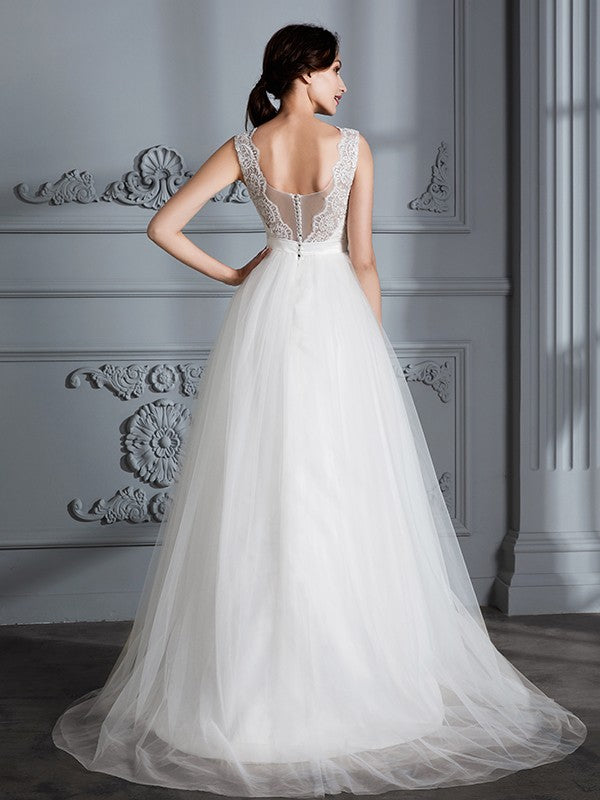 A-Line/Princess Sleeveless V-neck Sweep/Brush Train Tulle Wedding Dresses