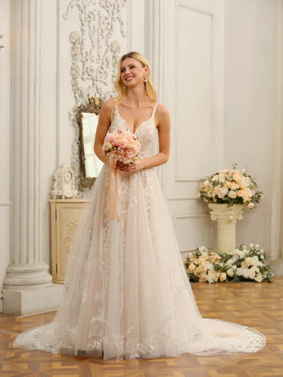 A-Line/Princess Spaghetti Straps Sleeveless Long Wedding Dresses With Appliques