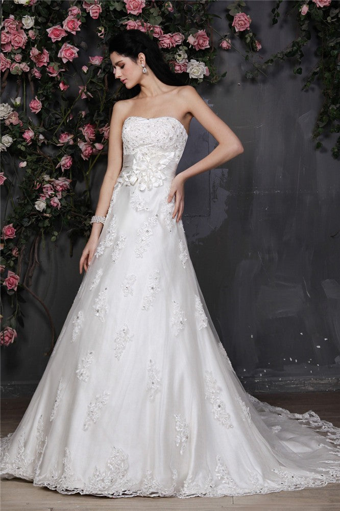 A-Line/Princess Strapless Sleeveless Beading Applique Hand-Made Flower Net Wedding Dresses