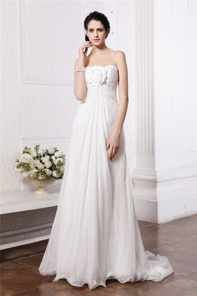 A-Line/Princess Strapless Sleeveless Beading Hand-Made Flower Long Chiffon Wedding Dresses - US 2 / UK 6 / EU 32