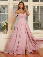 A-Line/Princess Stretch Crepe Ruffles Off-the-Shoulder Sleeveless Sweep/Brush Train Dresses