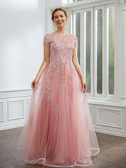 A-Line/Princess Tulle Applique Bateau Short Sleeves Floor-Length Dresses