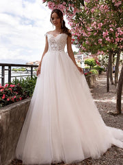 A-Line/Princess Tulle Applique Bateau Sleeveless Court Train Wedding Dresses