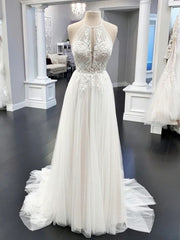 A-Line/Princess Tulle Applique Halter Sleeveless Sweep/Brush Train Wedding Dresses