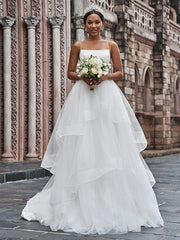 A-Line/Princess Tulle Spaghetti Straps Sleeveless Ruffles Sweep/Brush Train Wedding Dresses
