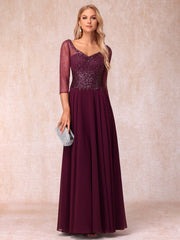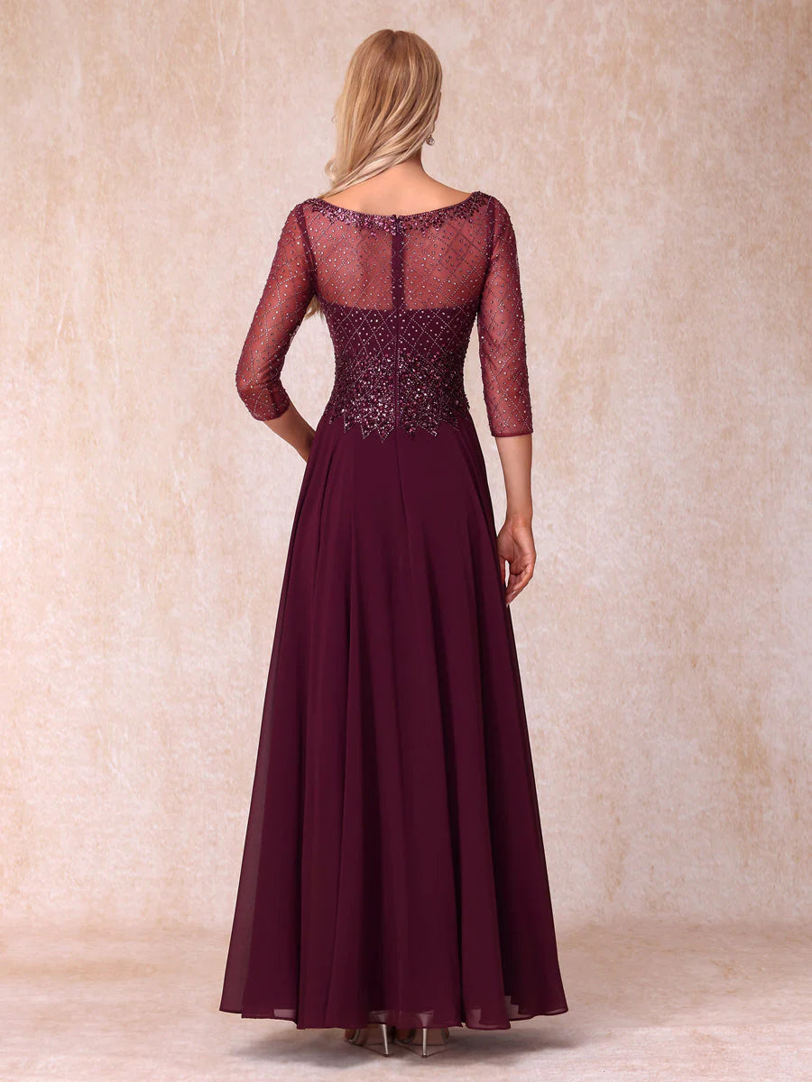 A-Line/Princess V-Neck 3/4 Sleeves Long Formal Evening Dresses With Beading