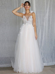 A-Line/Princess V-neck Beading Sleeveless Tulle Floor-Length Wedding Dresses