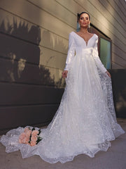 A-Line/Princess V-neck Long Sleeves Lace Applique Sweep/Brush Train Wedding Dresses