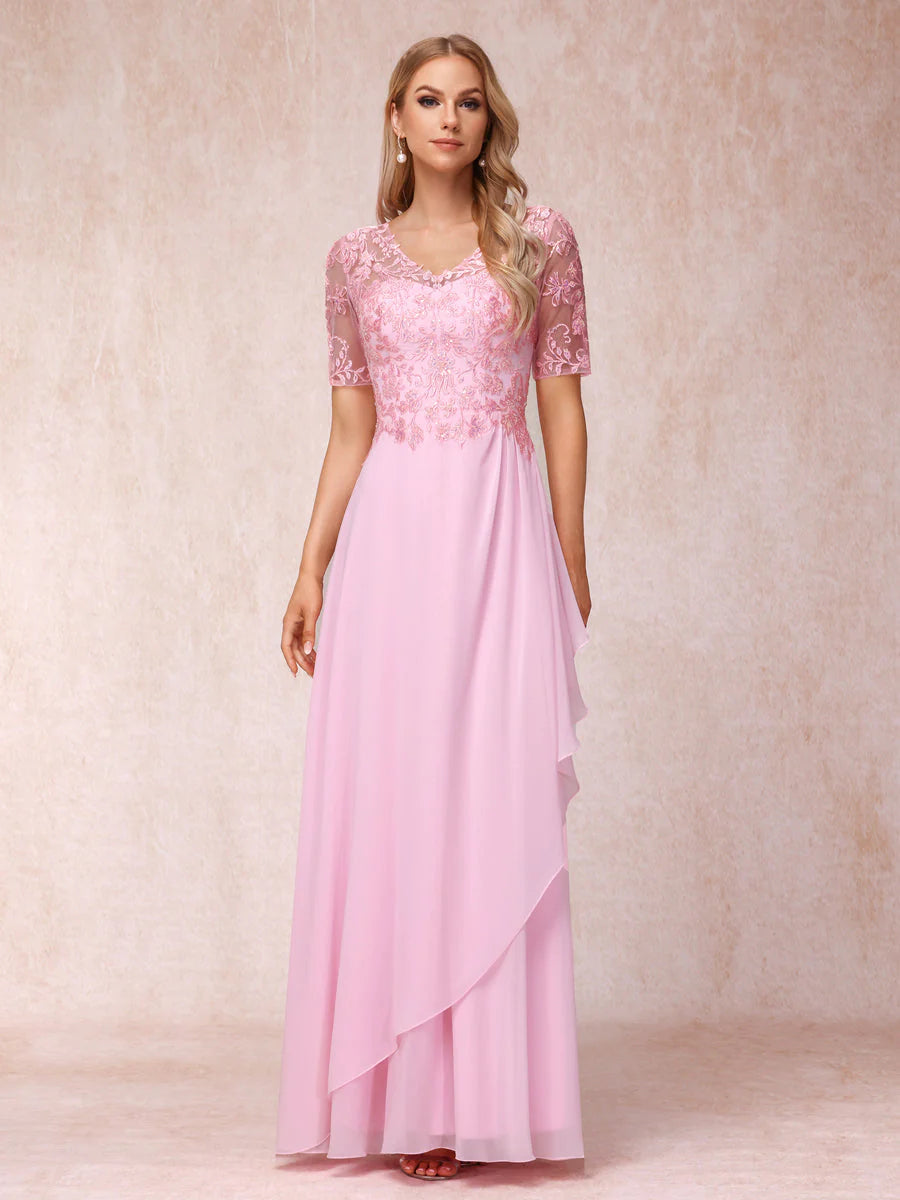 A-Line/Princess V-Neck Short Sleeves Long Formal Evening Dresses With Appliques