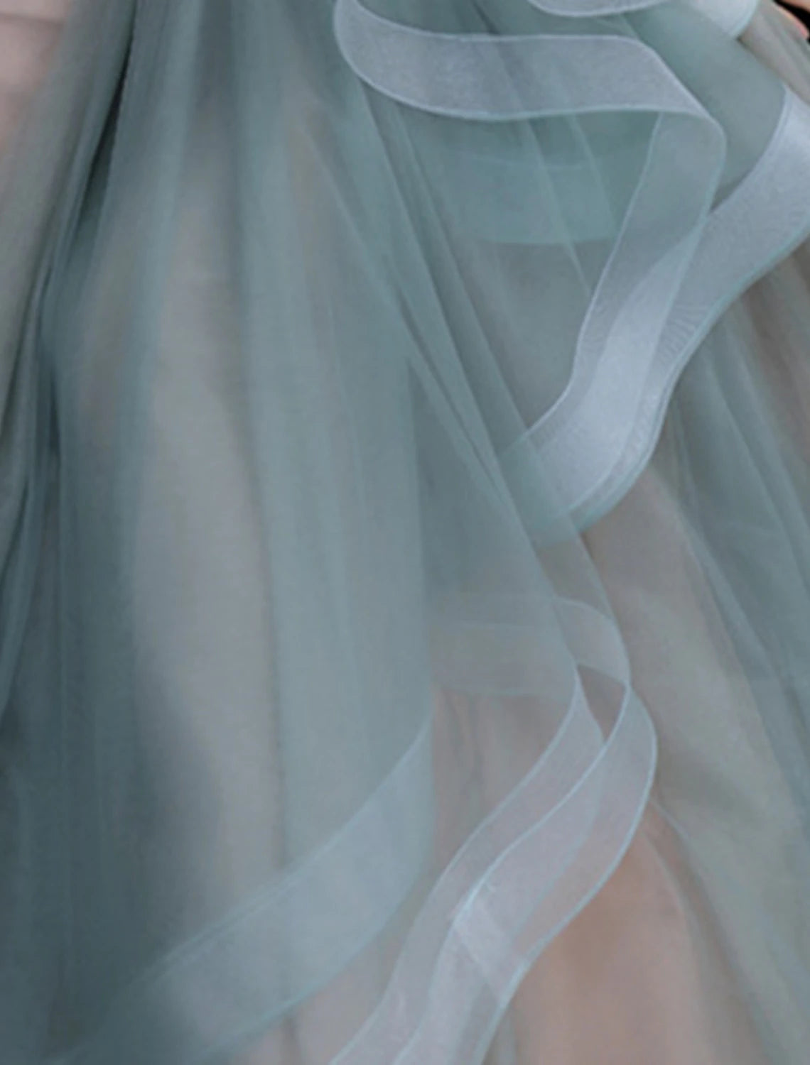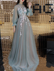 A-Line Prom Dresses Floral Dress Quinceanera Prom Floor Length Long Sleeve High Neck Tulle with Ruffles Appliques - US 2 / UK 6 / EU 32