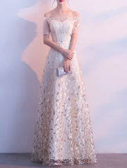 A-Line Prom Dresses Floral Dress Wedding Guest Prom Floor Length Short Sleeve Off Shoulder Tulle with Sash / Ribbon Embroidery