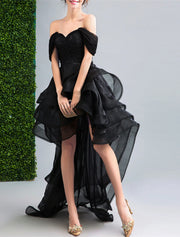 A-Line Prom Dresses Gothic Black Dress Party Wear Wedding Party Asymmetrical Sleeveless Off Shoulder Organza Backless with Ruffles Appliques - US 2 / UK 6 / EU 32