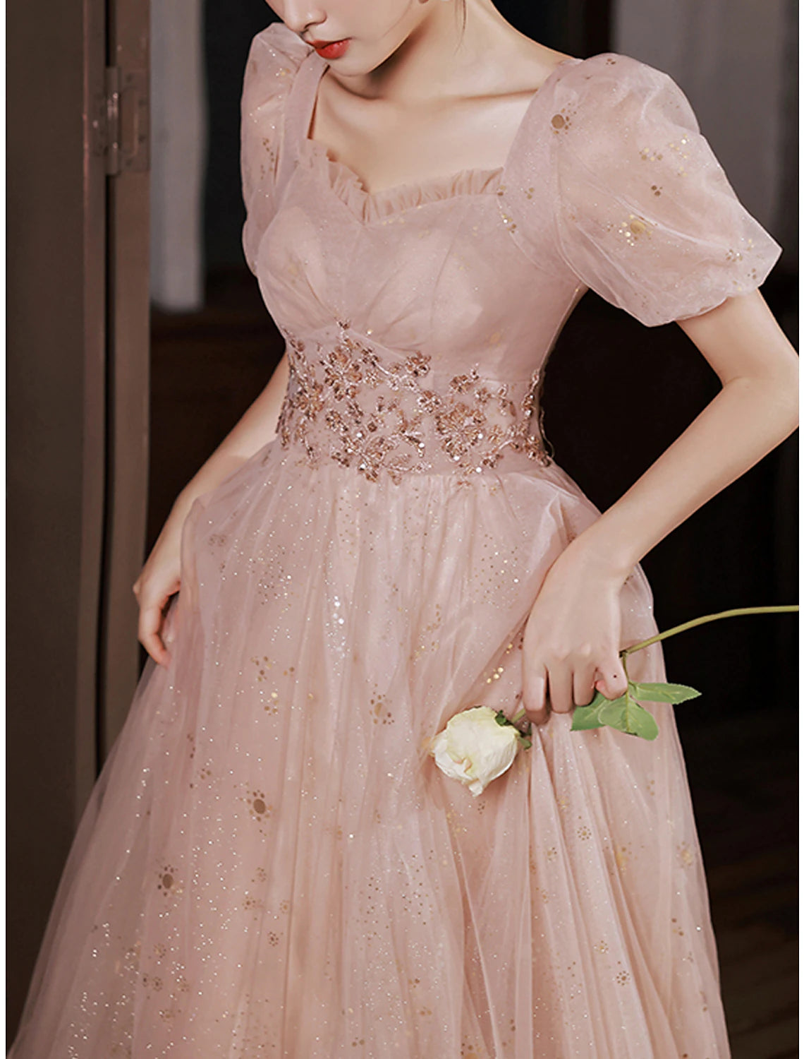 A-Line Prom Dresses Sparkle & Shine Dress Engagement Prom Floor Length Half Sleeve Square Neck Satin with Appliques - US 2 / UK 6 / EU 32