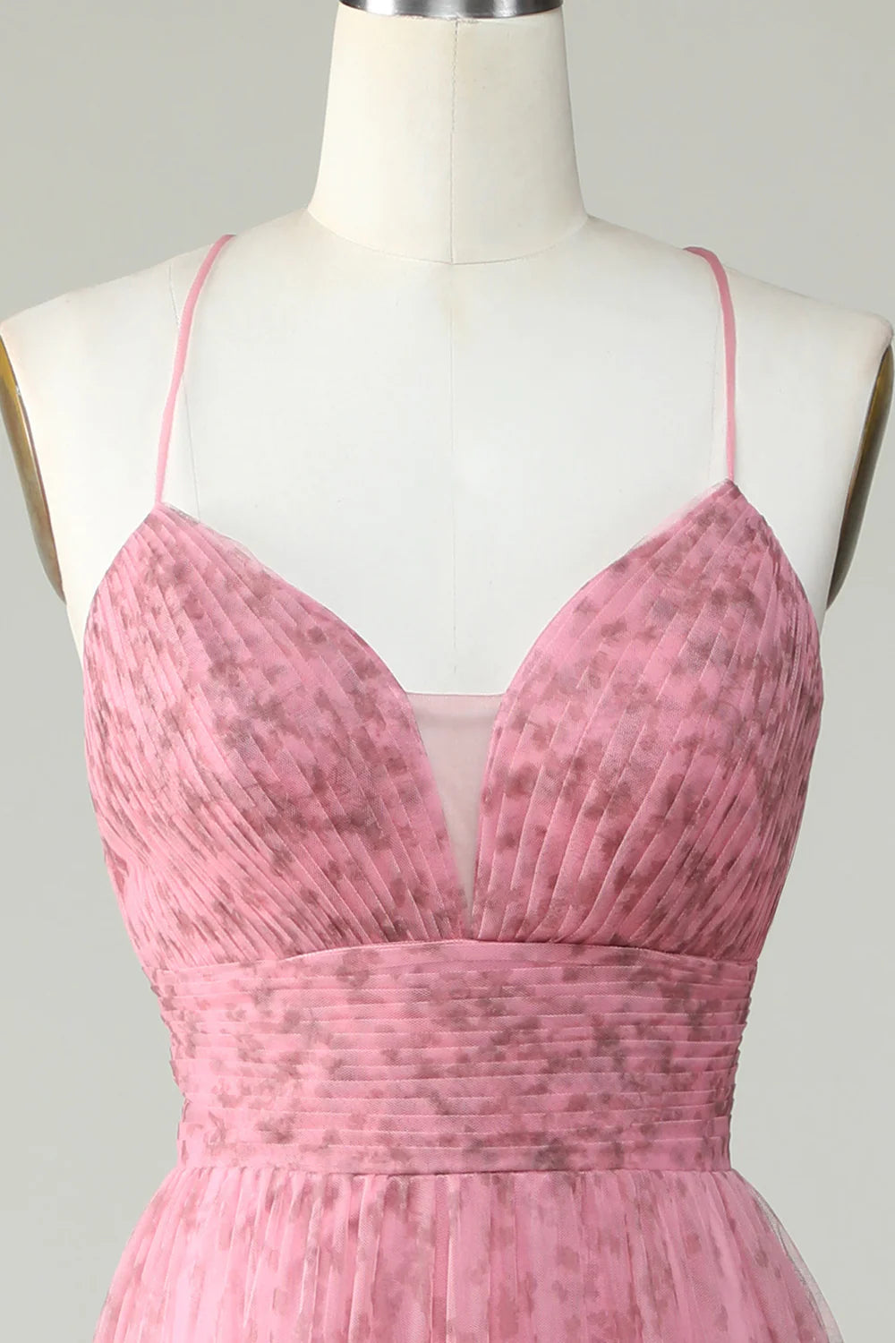 A Line Spaghetti Straps Layered Pink Tulle Prom Dress with Floral Printed
