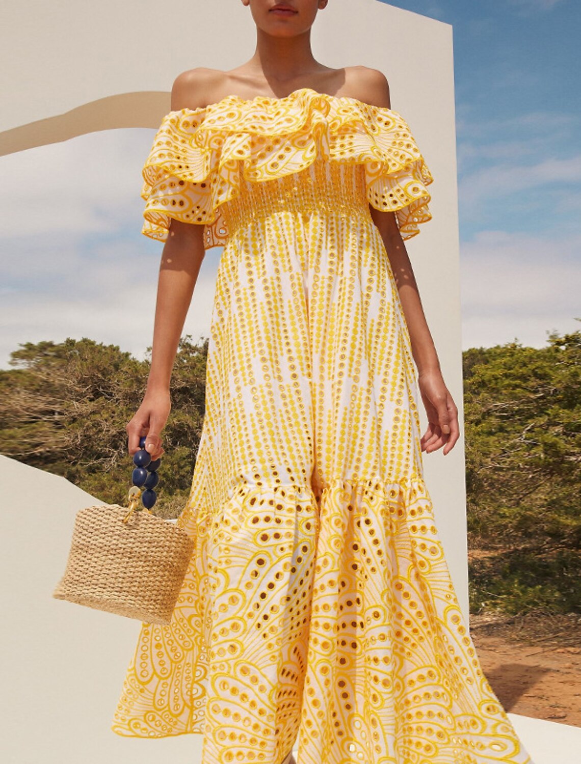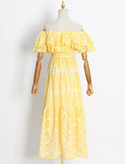 A-Line Wedding Guest Dresses Casual Dress Holiday Summer Ankle Length Short Sleeve Off Shoulder Polyester with Ruffles Embroidery - Daffodil / US 2 / UK 6 / EU 32