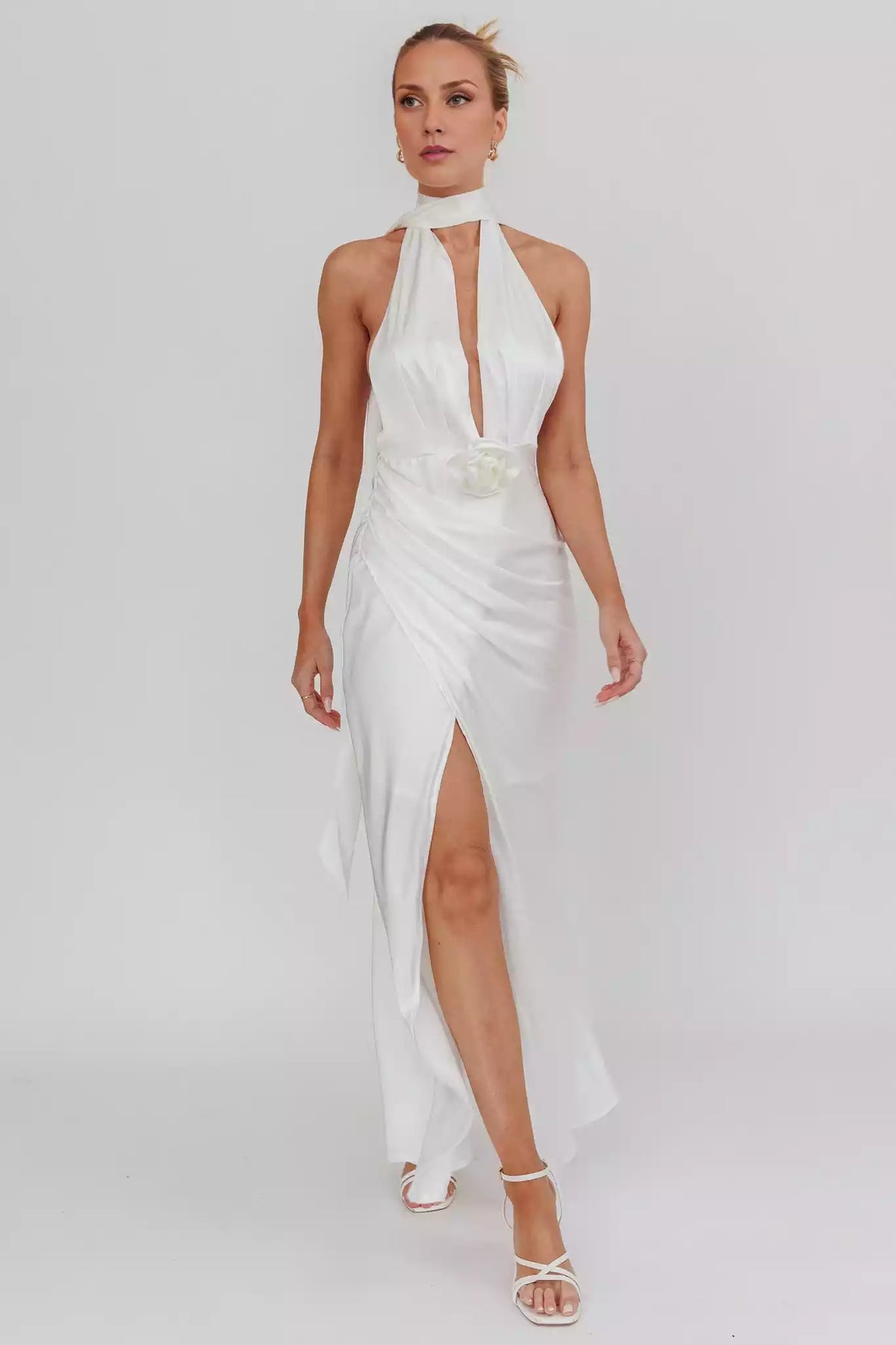 Absolutely stunning satin ultra long deep V-neck, backless, detachable rose leg slits, invisible back zipper Prom Dresses