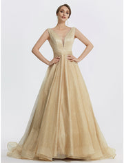 Ball Gown Prom Dresses Sparkle Dress Wedding Quinceanera Floor Length Sleeveless V Neck Tulle with Glitter - Champagne