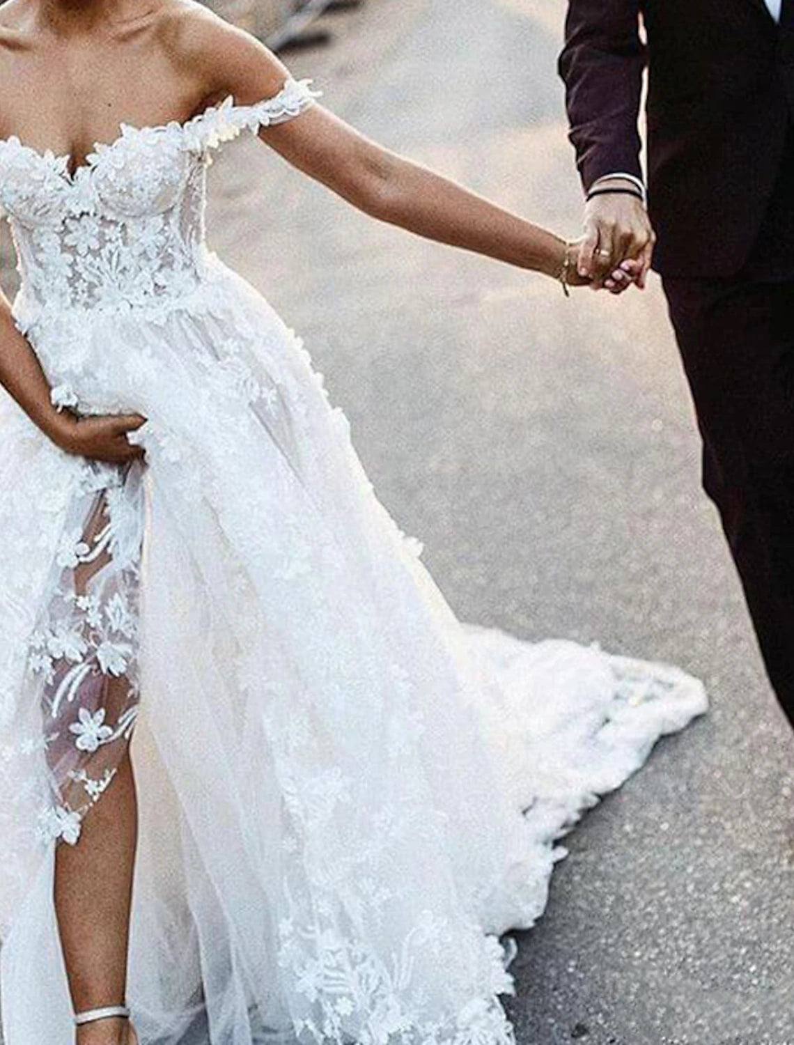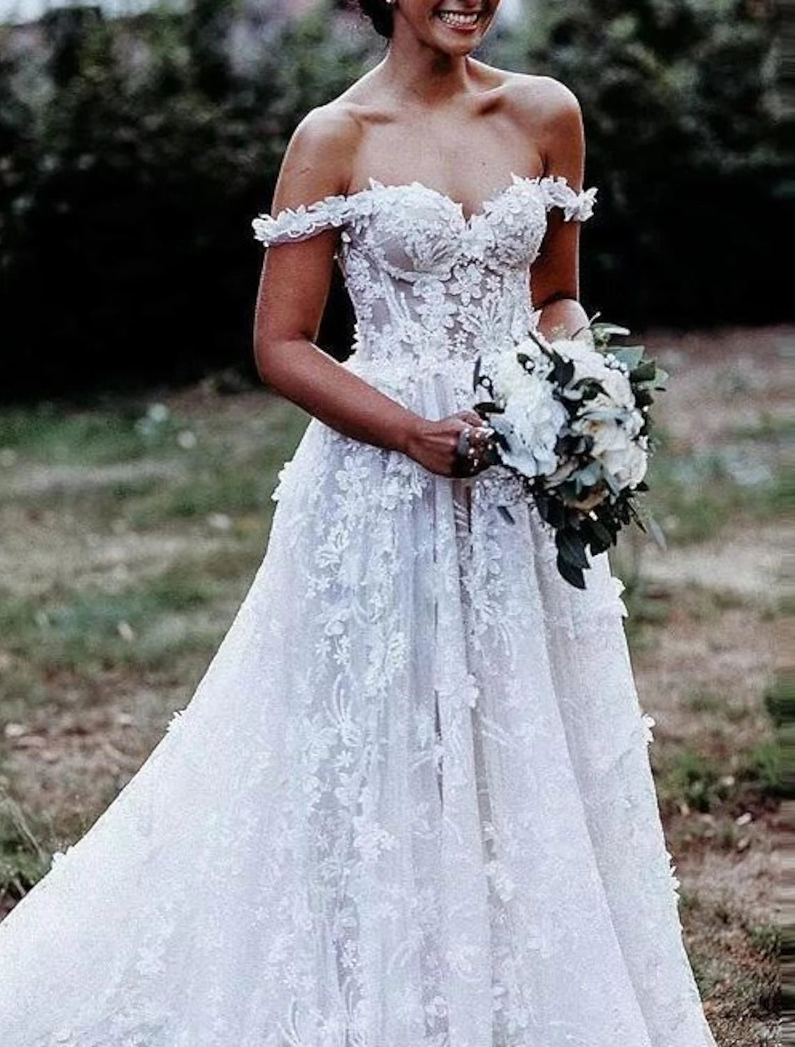 Beach Boho Wedding Dresses A-Line Off Shoulder Cap Sleeve Court Train Lace Bridal Gowns With Appliques Solid Color