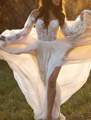 Beach Boho Wedding Dresses A-Line Off Shoulder Long Sleeve Court Train Satin Bridal Gowns With Lace Insert