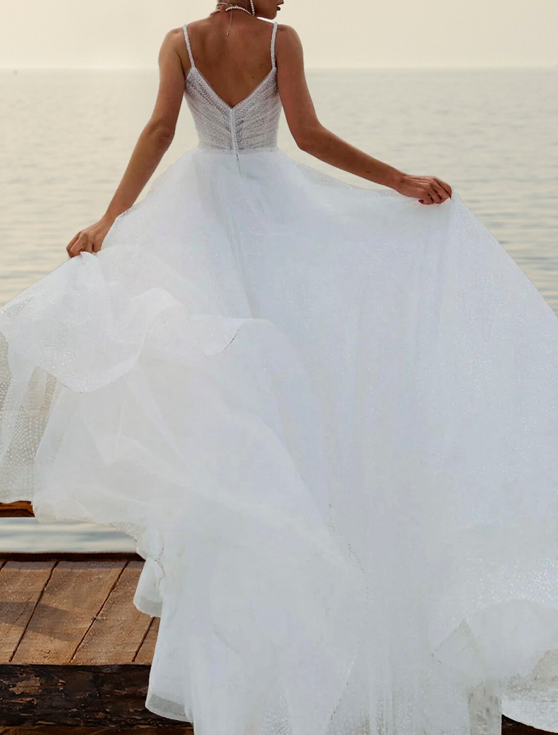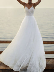 Beach Boho Wedding Dresses A-Line Sweetheart Camisole Spaghetti Strap Court Train Tulle Bridal Gowns With Solid Color
