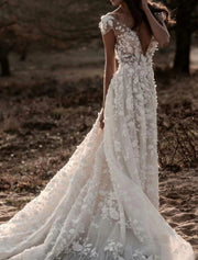 Beach Boho Wedding Dresses A-Line V Neck Cap Sleeve Court Train Lace Bridal Gowns With Appliques - US 2 / UK 6 / EU 32