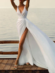 Beach Boho Wedding Dresses A-Line V Neck Sleeveless Court Train Chiffon Bridal Gowns With Split Front Solid Color