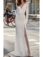 Beach Casual Glitter & Sparkle Wedding Dresses Sheath / Column V Neck Long Sleeve Sweep / Brush Train Stretch Fabric Bridal Gowns With Sash / Ribbon Bow(s) - US 2 / UK 6 / EU 32