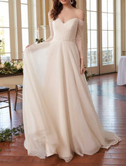 Beach Casual Wedding Dresses A-Line Off Shoulder Long Sleeve Court Train Chiffon Bridal Gowns With Solid Color