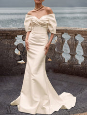 Beach Casual Wedding Dresses Mermaid / Trumpet Off Shoulder Short Sleeve Court Train Satin Bridal Gowns With Solid Color