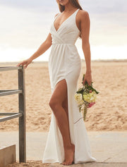 Beach Casual Wedding Dresses Sheath / Column Camisole V Neck Spaghetti Strap Floor Length Chiffon Bridal Gowns With Split Front Solid Color
