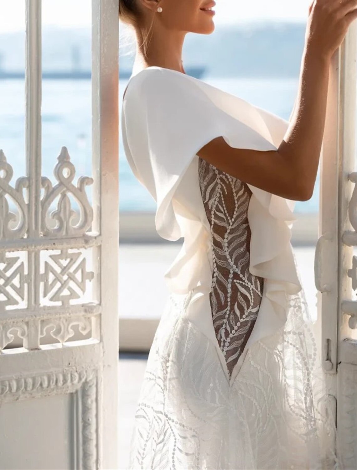 Beach Formal Wedding Dresses A-Line V Neck Cap Sleeve Sweep / Brush Train Lace Bridal Gowns With Appliques Solid Color