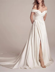 Beach Little White Dresses Wedding Dresses A-Line Off Shoulder Regular Straps Court Train Satin Bridal Gowns With Pleats Ruched