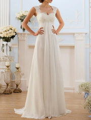 Beach Open Back Wedding Dresses A-Line Sweetheart Cap Sleeve Sweep / Brush Train Chiffon Bridal Gowns With Lace Insert